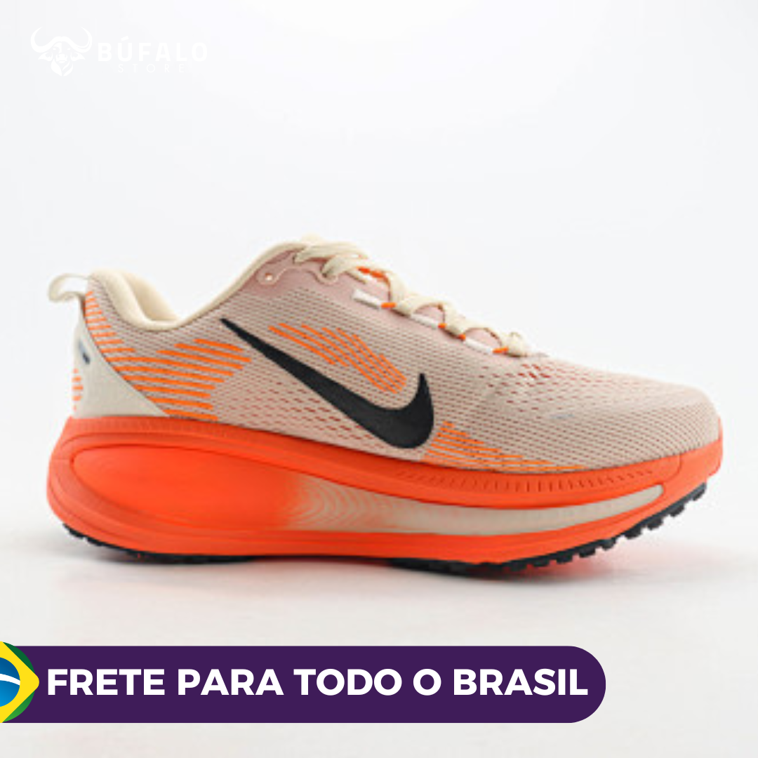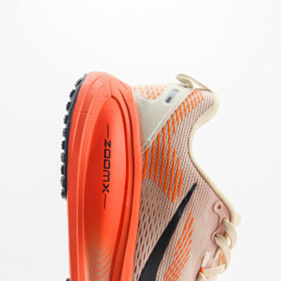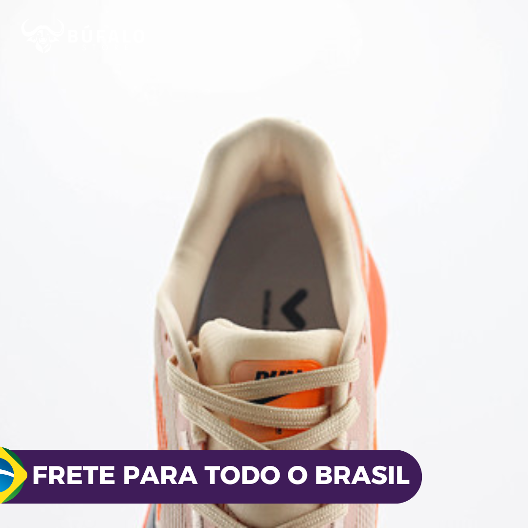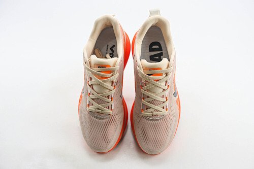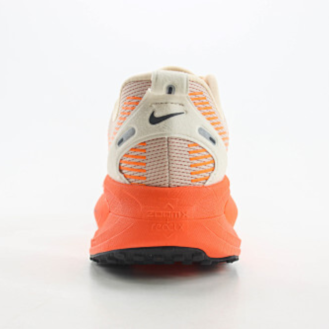 O Nike ZoomX Invincible Run Flyknit 3 chega em uma combinação de cores moderna e marcante, unindo o bege claro com detalhes em laranja vibrante para um visual esportivo e sofisticado.